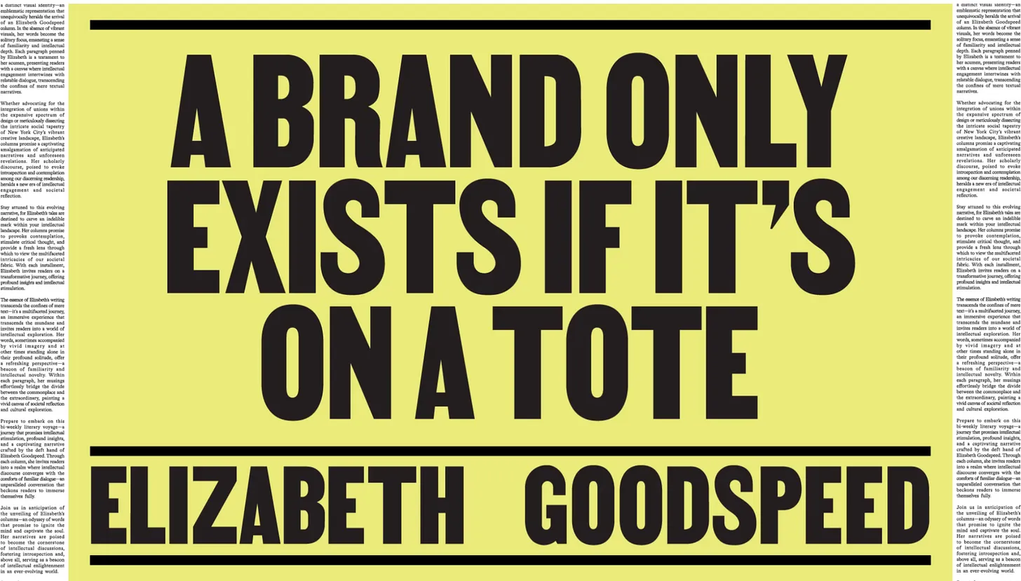 A provocação vem de um texto da Elizabeth Goodspeed, desginer e escritora. O artigo foi publicado – em inglês – no portal It's Nice That, com o título original “A brand only exists if it's on a tote”. Nele, Goodspeed que analisa o poder que os mockups ganharam no mercado de branding ao longo dos anos.