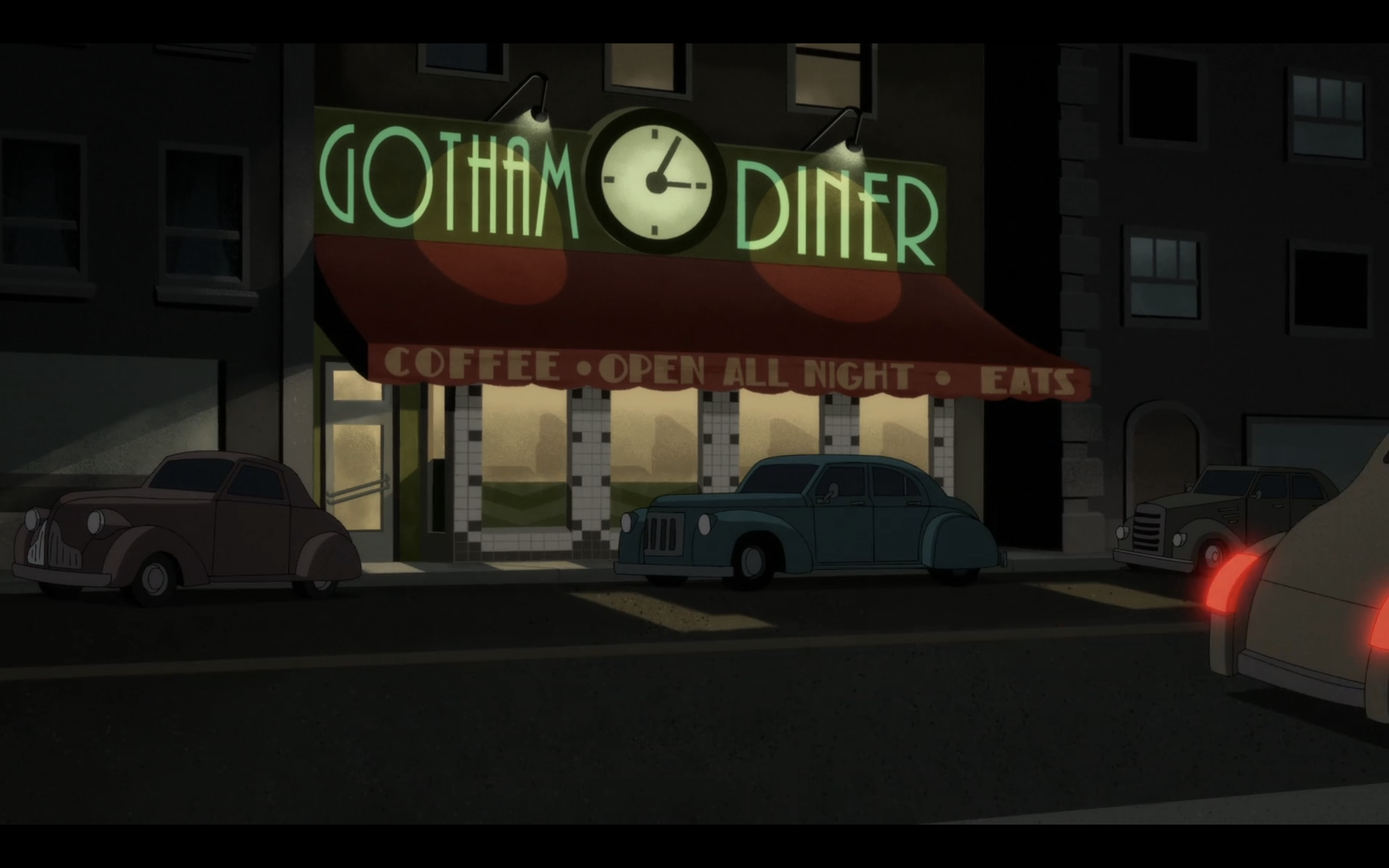O Gotham Diner entrega tudo: basicamente todas as características Déco que comentamos até agora agora estão aqui. E lembra da sinuca do Fat Paulie? Aqui vemos novamente o peso assimétrico nas letras que estão no toldo do diner.