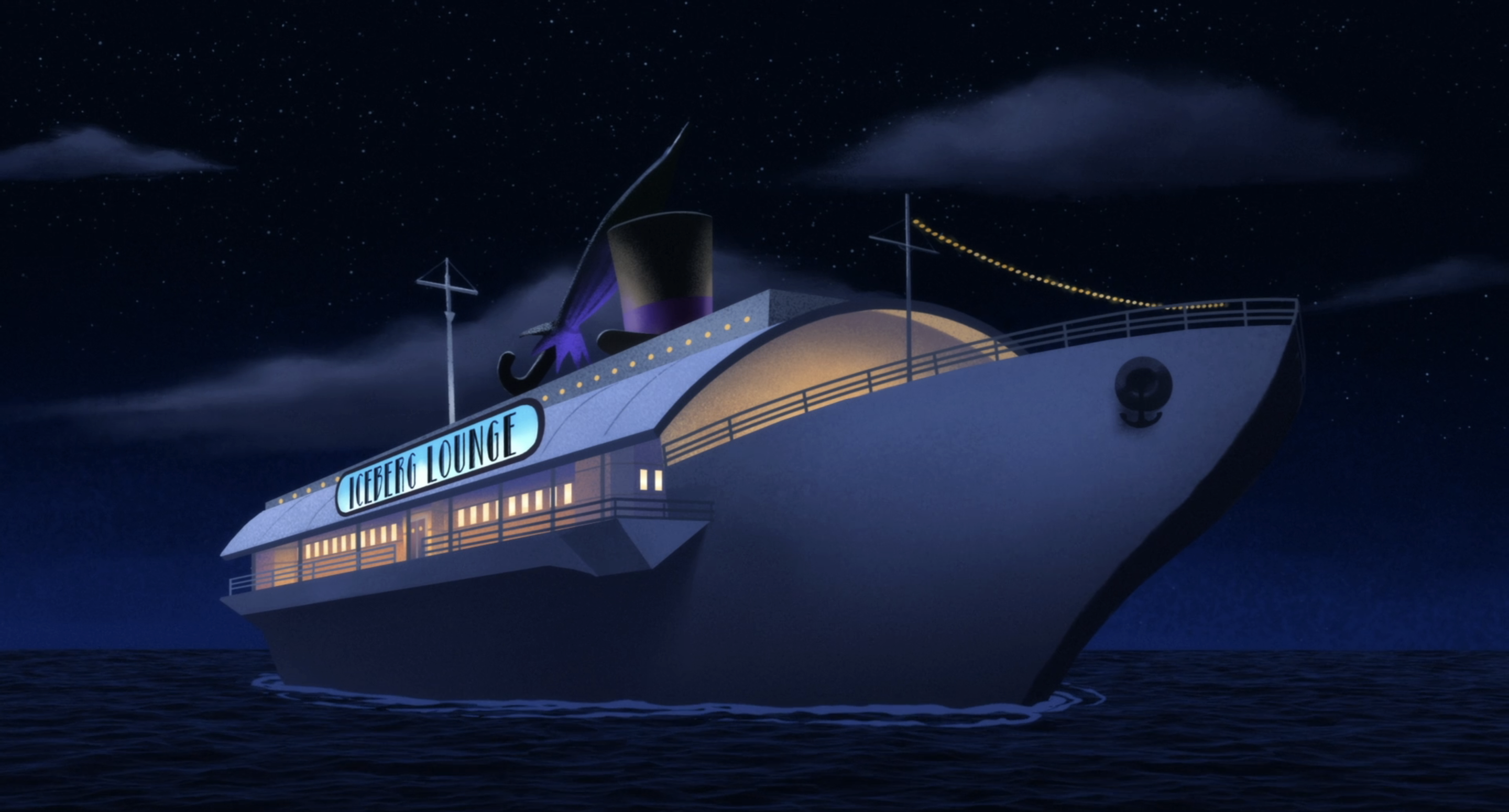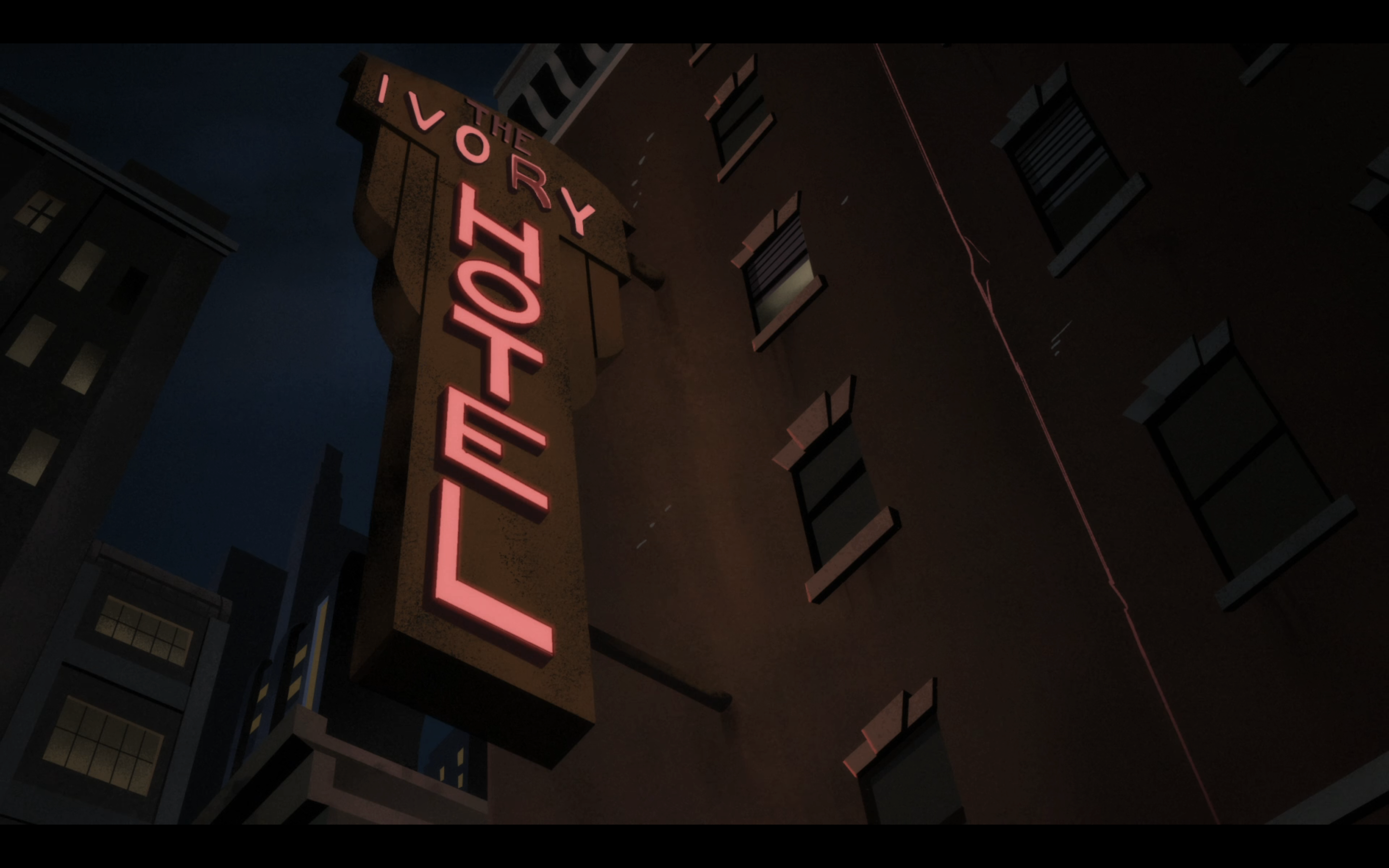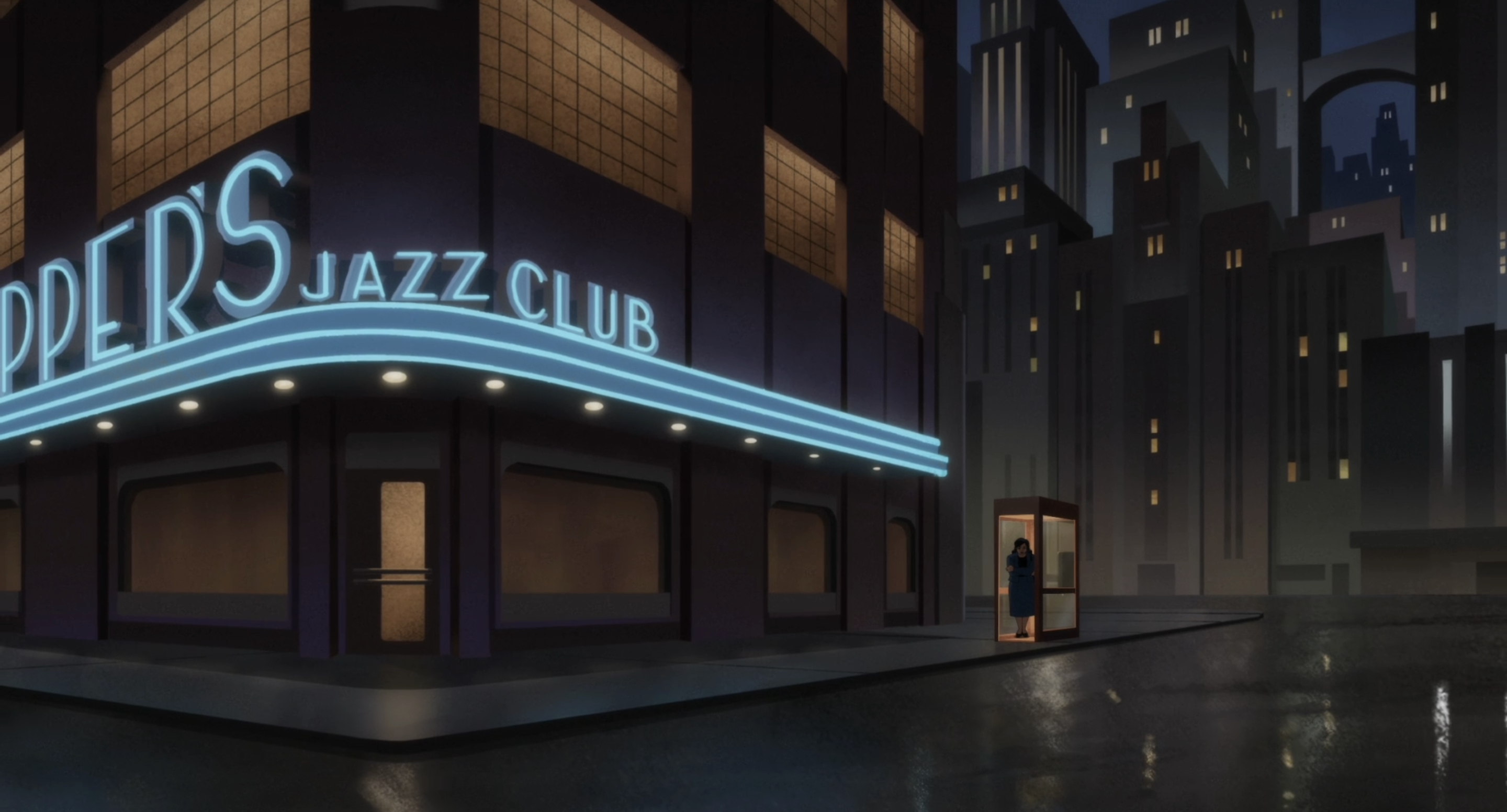 Pode fechar tudo: encontramos o melhor uso de tipografia na história da animação! Não tem muito de Art Déco aqui, e não é nem que o desenho da fonte esteja fora de série, mas a composição da cena, com a grandeza do letreiro iluminado, está basicamente perfeita.