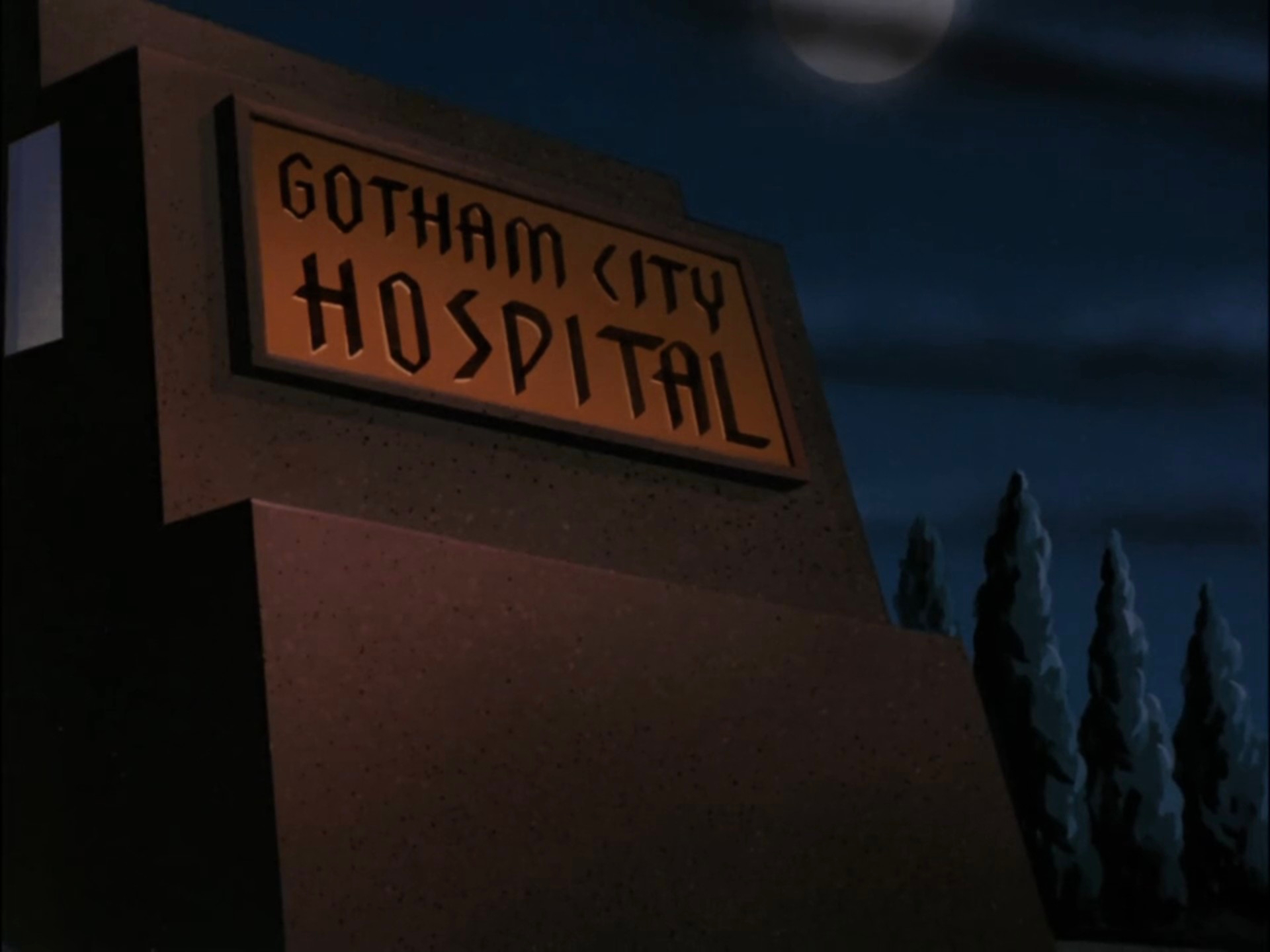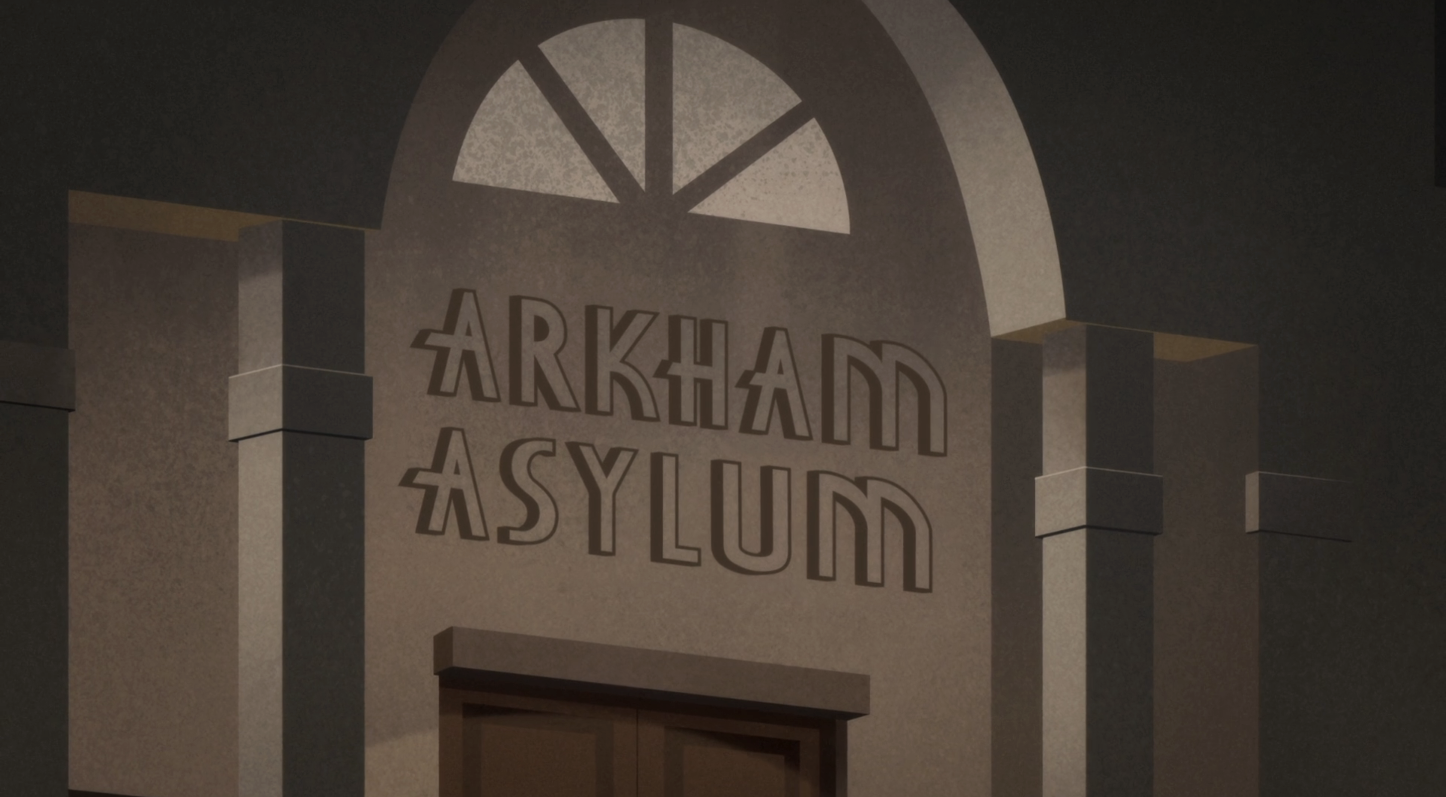 O letreiro do Asilo Arkham (o hospital psiquiátrico onde ficam internados boa parte dos vilões do Batman) exagera o elemento da barra alongada e ainda inclui algumas formas orgânicas, como no “K” e no “M”.