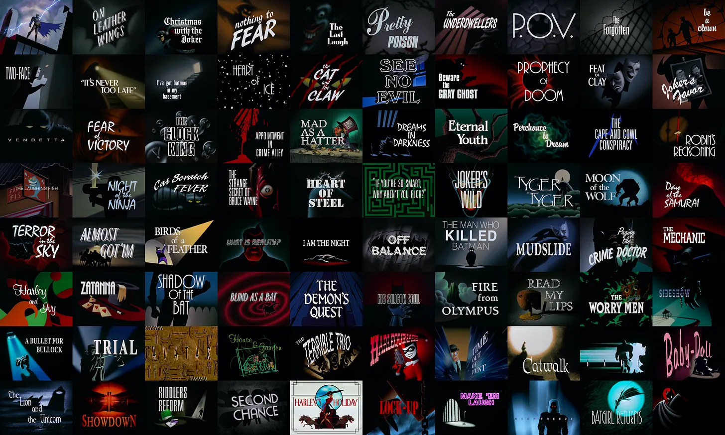 A primeira coisa que precisamos reparar (e louvar!) sobre a série de 92 é que ela criou uma cartela de abertura diferente para cada episódio, com fontes e layouts que seguem o tema do episódio. Amplie a imagem abaixo para saborear cada uma delas (78 no total).