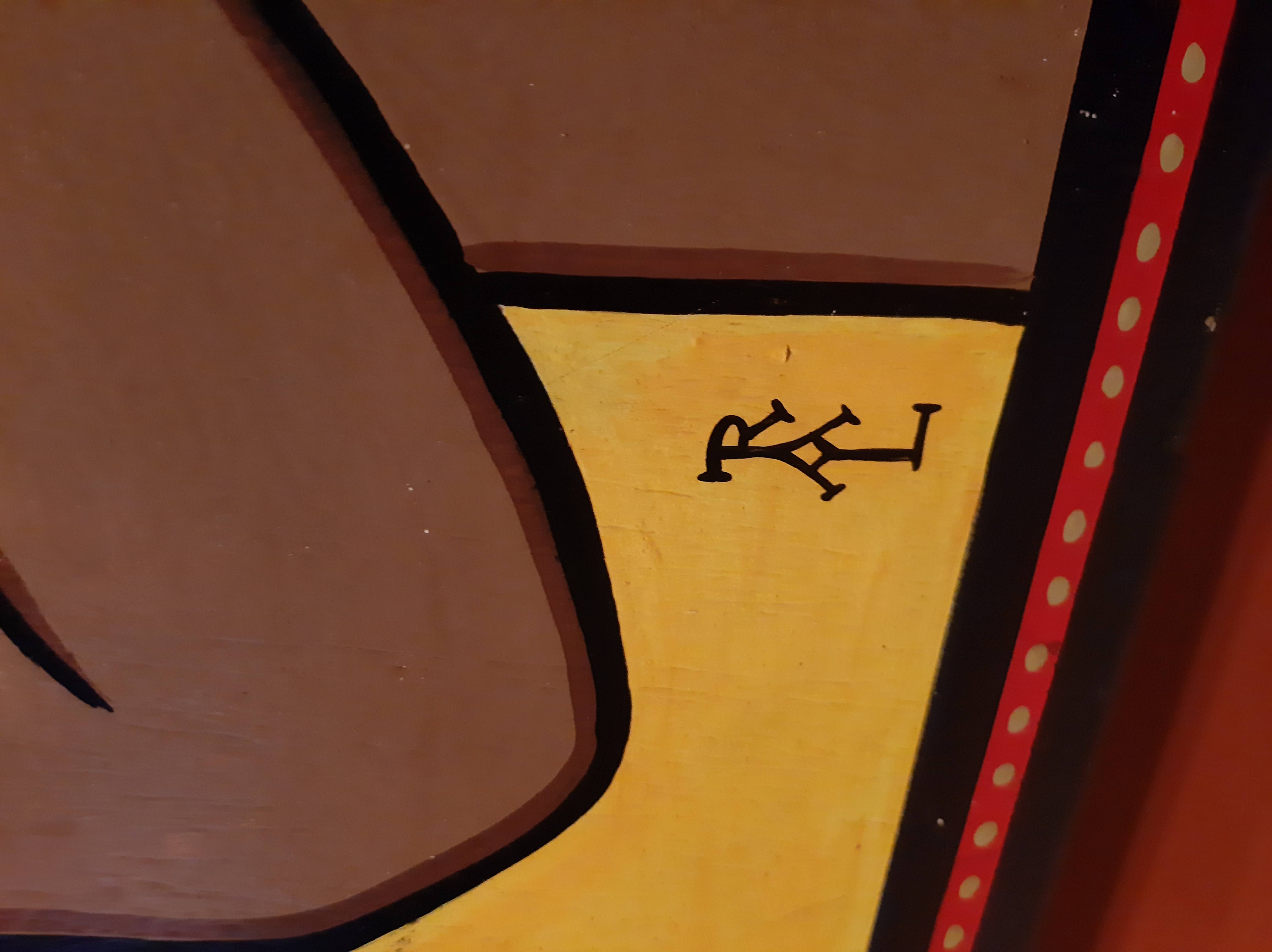 Monograma do artista Romero de Andrade Lima usando como base o alfabeto sertanejo mostra possibilidades do alfabeto como logotipo — Foto tirada na exposição“Movimento Armorial — 50 anos”, no CCBB-RJ (2022, arquivo pessoal)