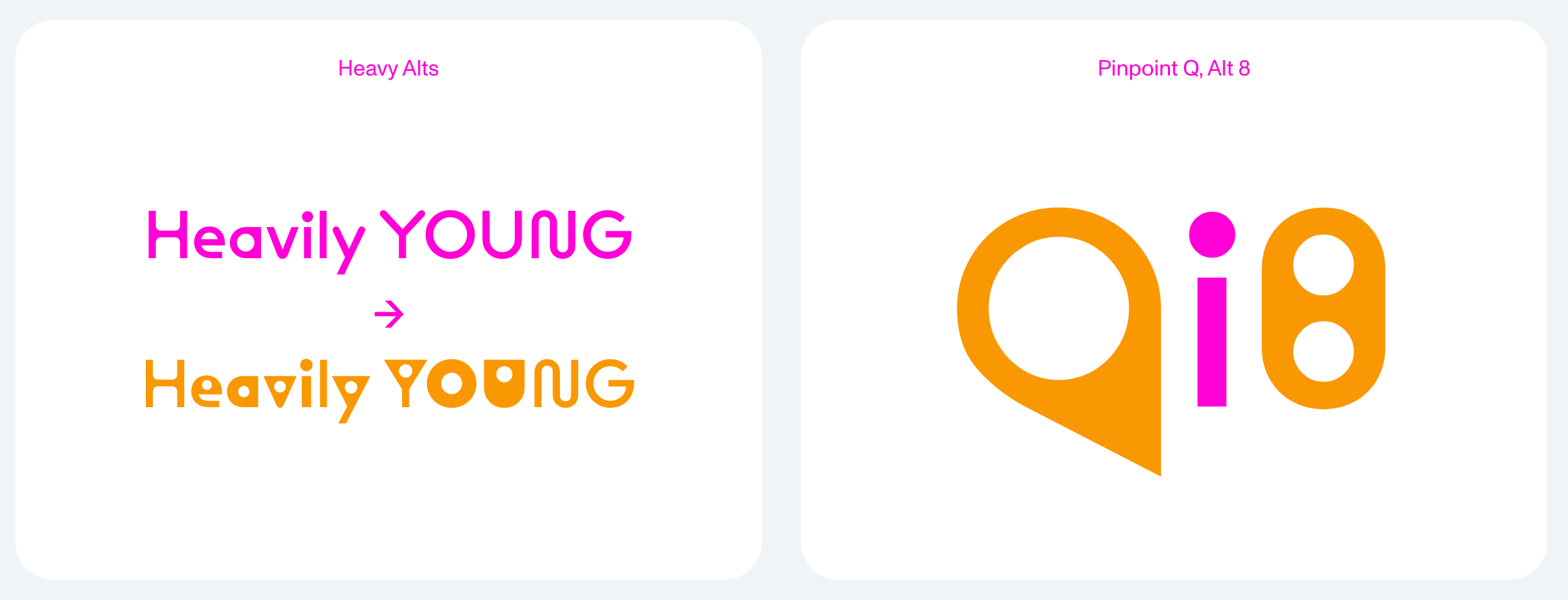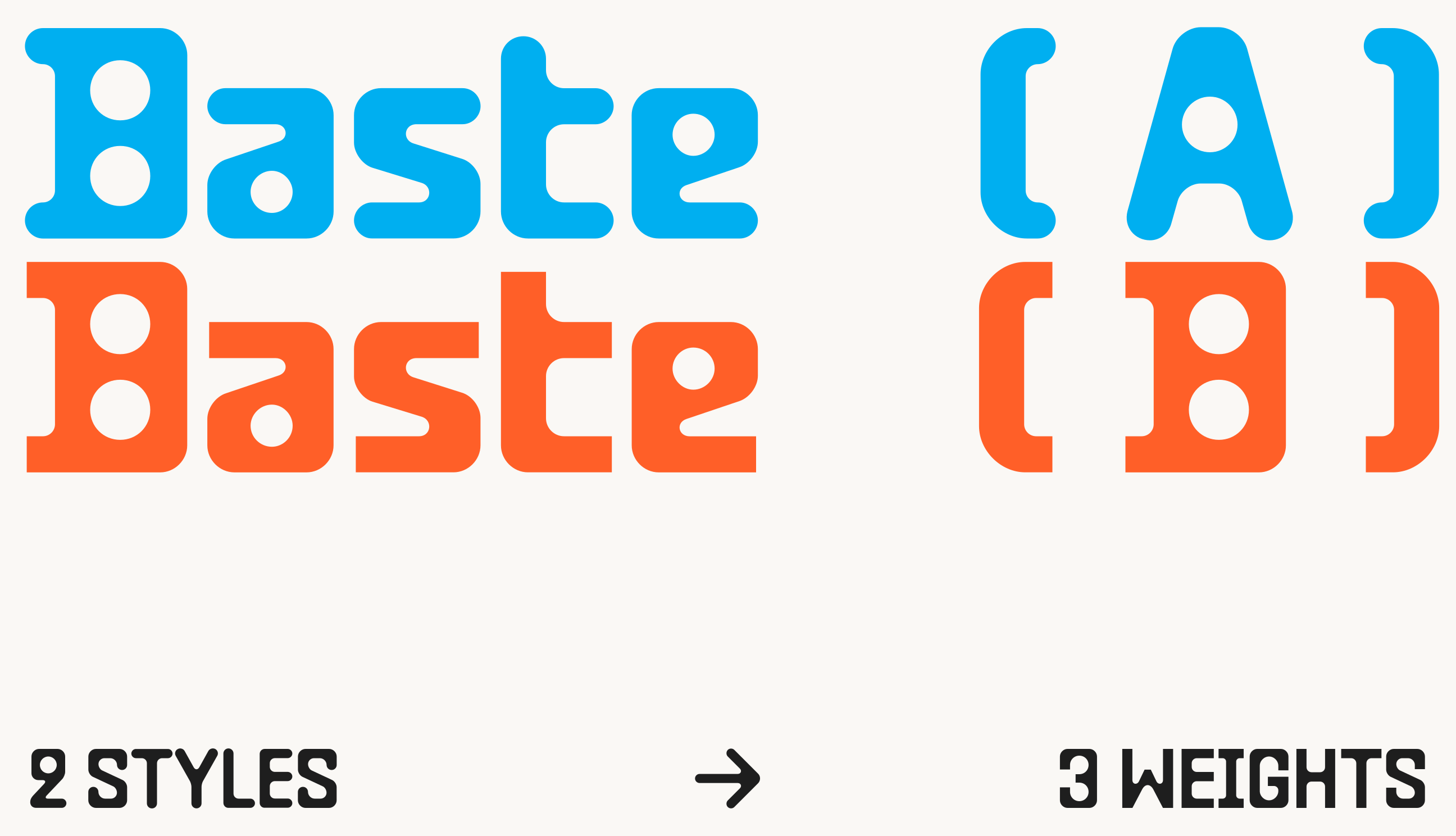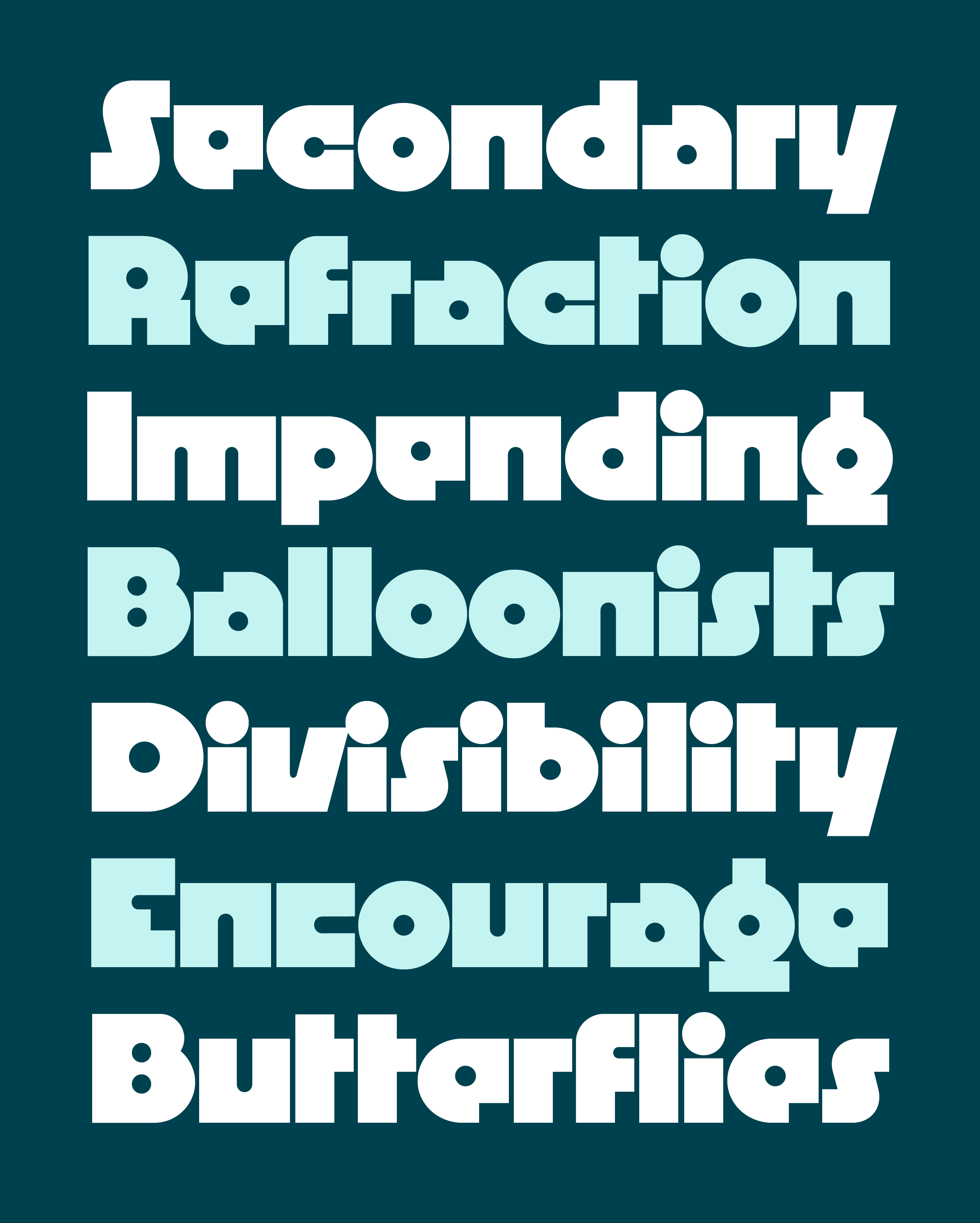 O curioso é que a própria Dinamo indica que essa família surgiu como uma estrutura suíça de letras, ou seja, bem clássica e neutra. Assim, as intervenções expressivas foram colocadas por cima de um esqueleto um tanto tradicional. Além da contraforma de bolinha, essas fontes são marcadas também pelo que eles chamam de “movimentos de espaguete”.