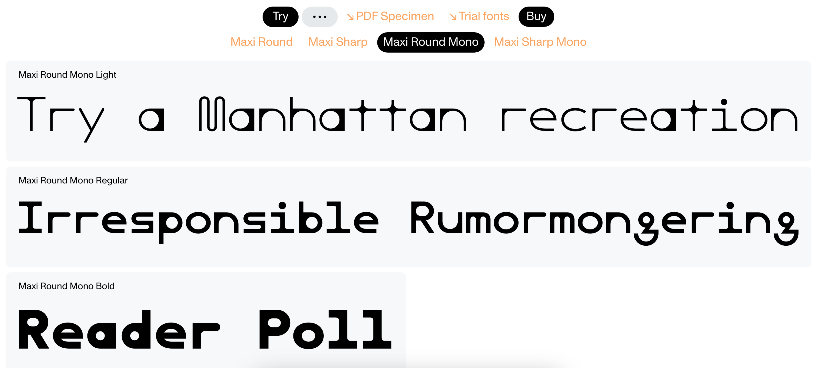 A Dinamo é, provavelmente, a type foundry (famosa fazedora de fontes) mais descolada do universo, com uma capacidade enorme de absorver e também de criar tendências. Em 2020, eles lançaram a Maxi, que apresenta a contraforma de bolinha em diversos “sabores” diferentes. A família conta com a Maxi Sharp e Maxi Round, que também têm equivalentes monoespaçadas (fontes cujas letras ocupam a mesma largura).