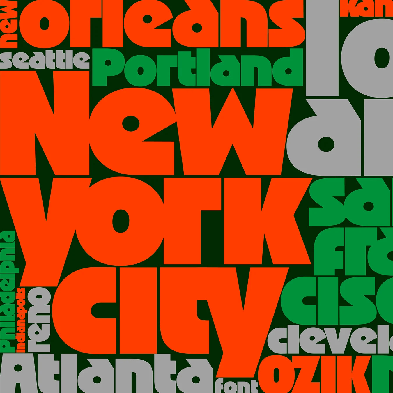 A Ozik é outra tipografia muito influente e que até usa expedientes parecidos com a da Megazoid, como o contraste bem marcado entre quadrados e círculos, mas, ao contrário da colega, ela não aposta tanto em um aspecto futurista, além de ter particularidades com o pingo do “i” achatado e uma brincadeira com as proporções das letras (por exemplo, “c” e “f” estreitos).