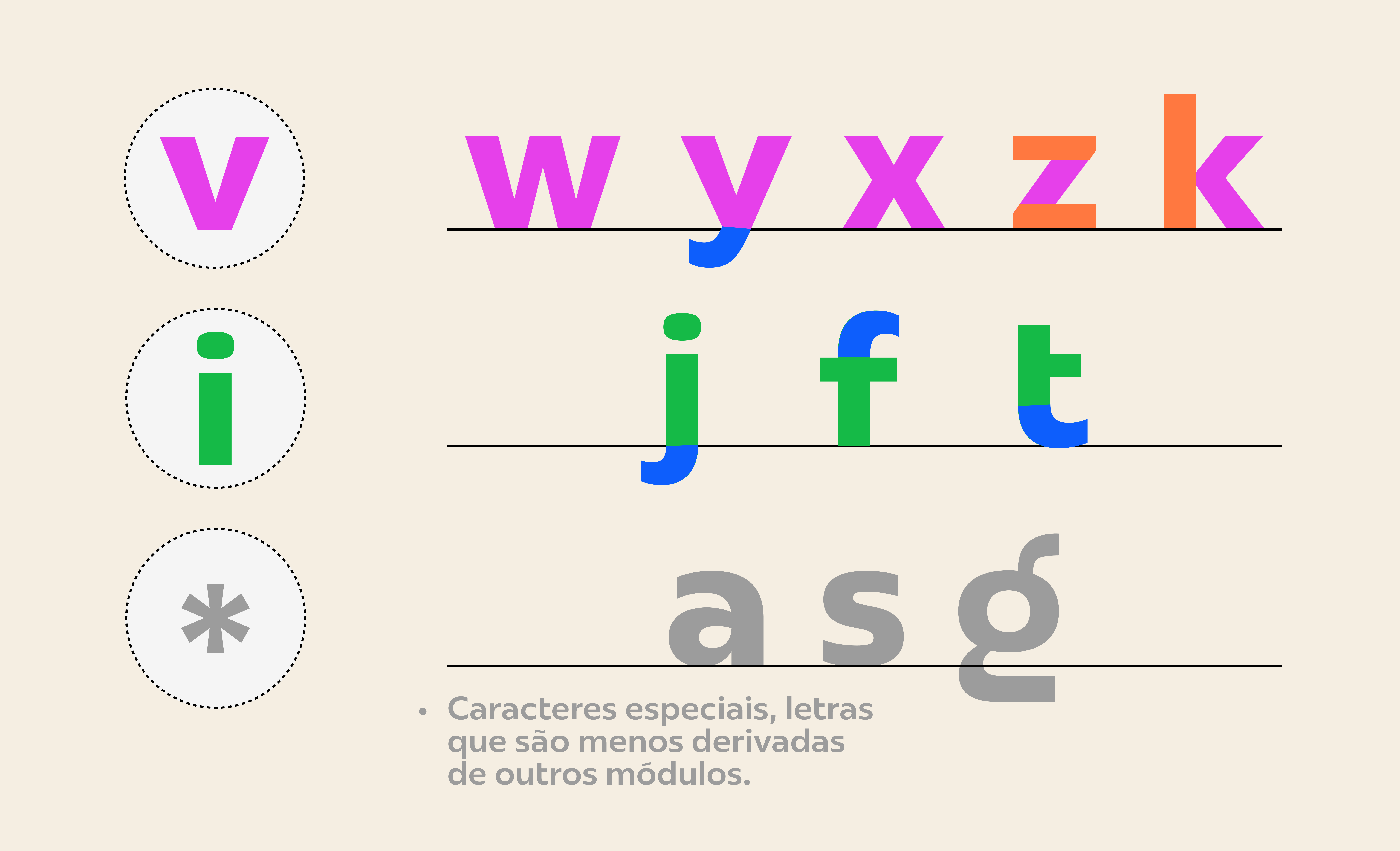 O desenho tipográfico é um trabalho muito baseado em módulos. Isso quer dizer que uma mesma estrutura pode ser usada para várias letras. Assim que você tiver algumas letras, vai desenhar as próximas usando elementos que já foram criados para as primeiras.