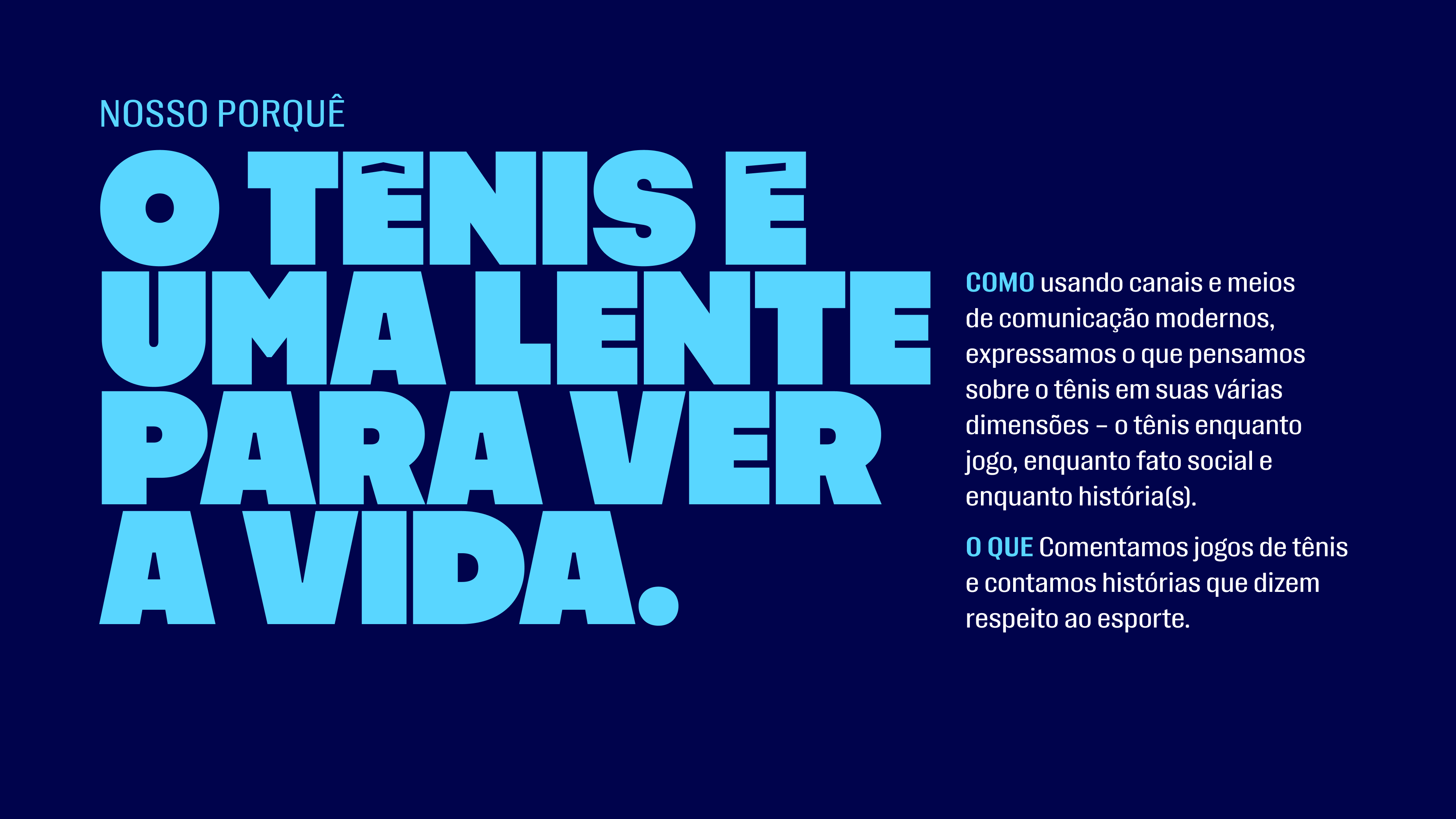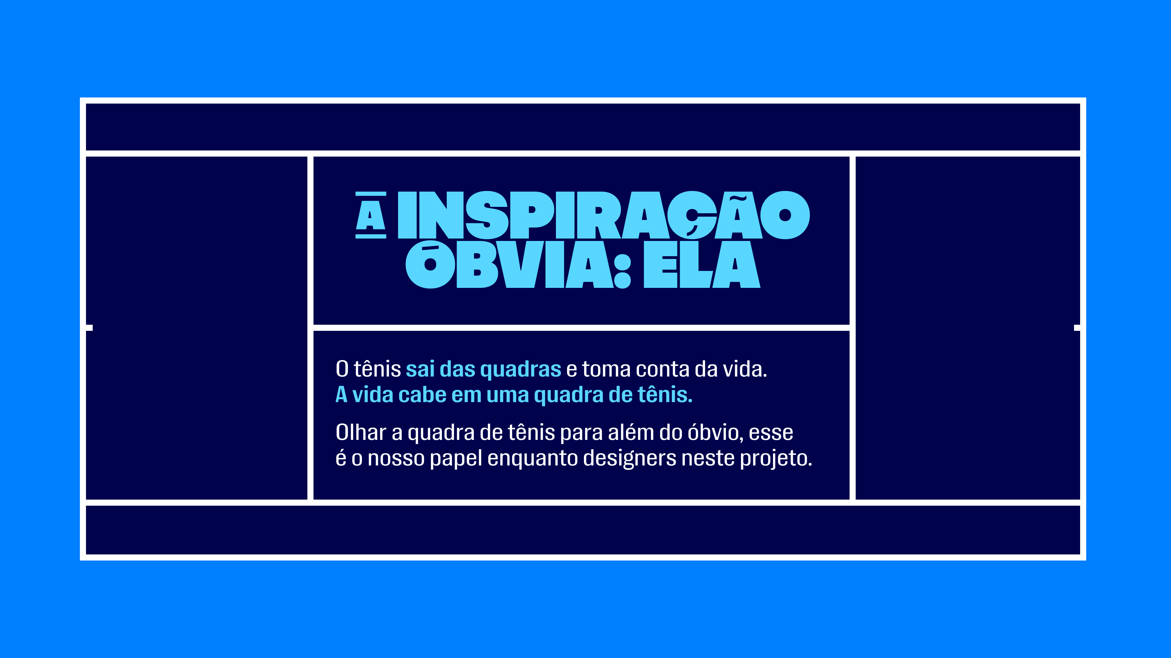 Como fãs de tênis, encontramos na marca uma oportunidade de manifestar nossa paixão pelo assunto e, ao mesmo tempo, colaborar com ela fazendo o tipo de trabalho que mais gostamos, com muita personalidade. A identidade visual anterior era efetiva, porém não se destacava nas redes sociais. Ainda tímida, ela pedia por um tratamento que extraísse todo o potencial da marca. Em outras palavras, os elementos estratégicos e visuais precisavam alcançar o profissionalismo que o Tênis Além do Óbvio já tinha no conteúdo jornalístico.