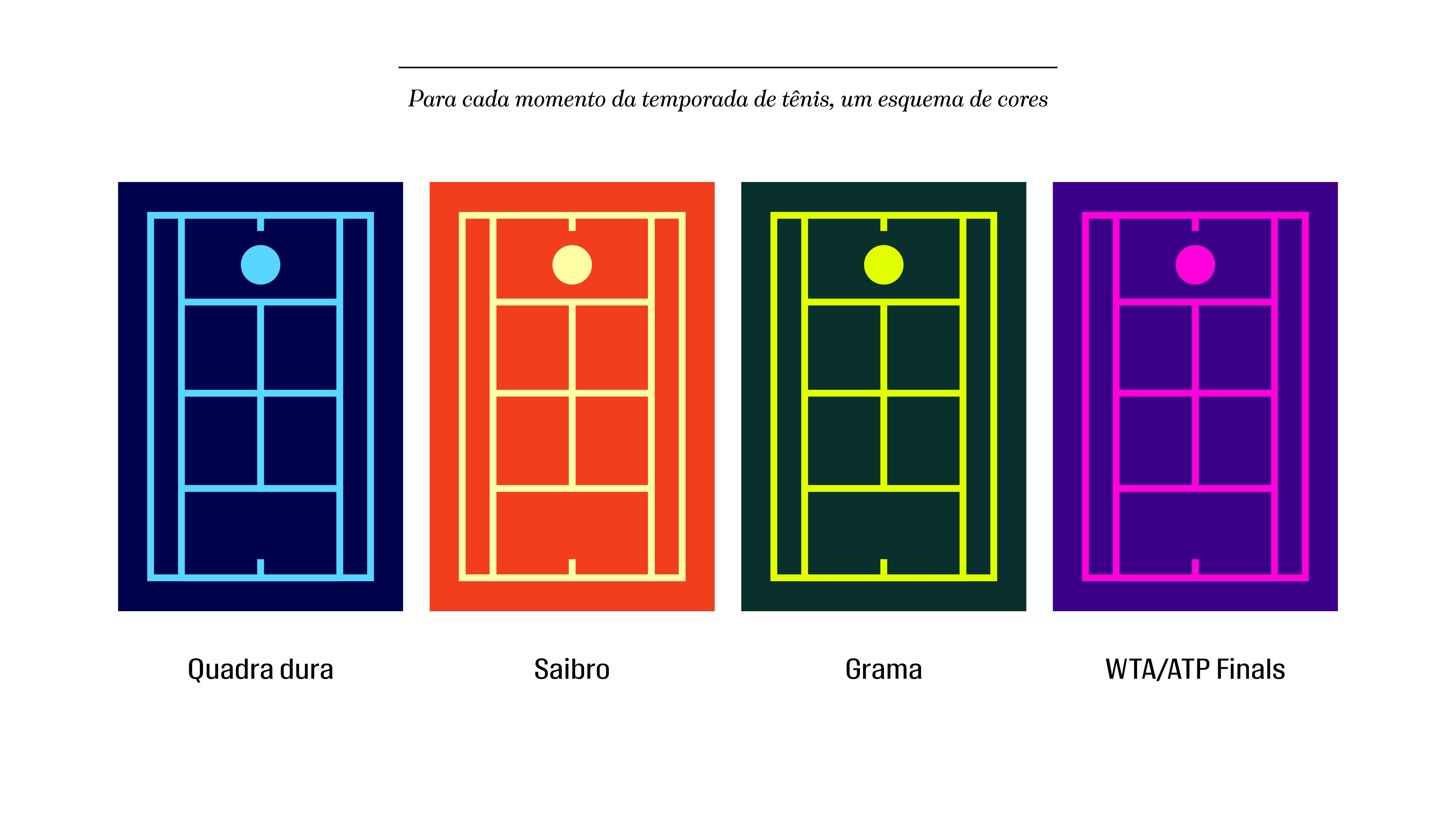 O tênis acontece em quadras abertas e passa por muitas temporadas ao longo do ano: quadra dura, saibro, grama, Grand Slams. Circuito masculino e feminino. Tênis por equipes (como Copa BJK/Copa Davis) versus a temporada regular. Mudar de cores para cada ocasião é MUITO tênis! Se as marcas de tênis mudam as cores e as roupas dos atletas a cada temporada, por que a mídia não pode fazer o mesmo?