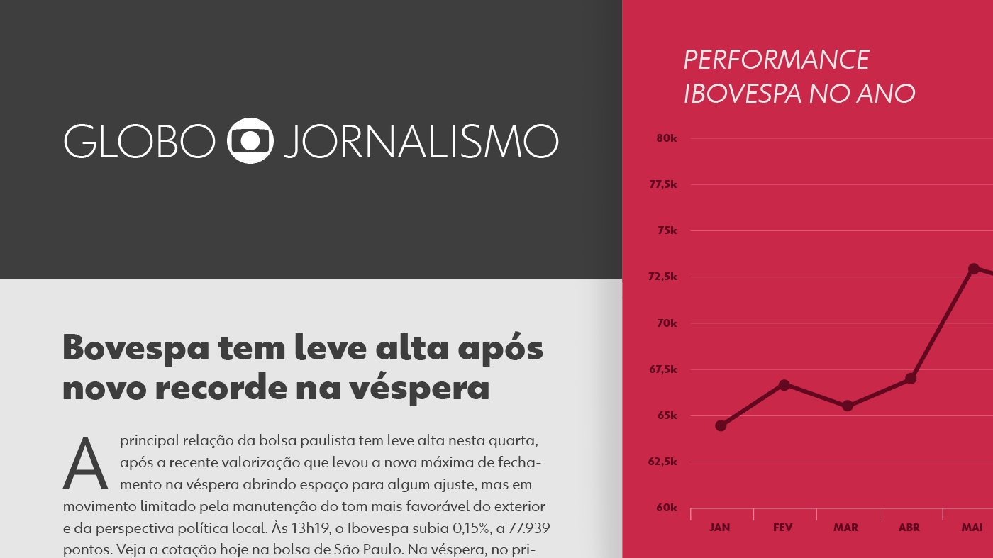 Globotipo is already in use throughout Globo’s institutional communication, expanding the creative range of the communication and art team, entering TV and online programming as they renew their identities. In journalism, regional newspapers in many regions (Minas, SP, Rio de Janeiro and others) and Jornal Nacional already use the fonts to their full capacity, occupying a prominent place in information, infographics and audience interaction.