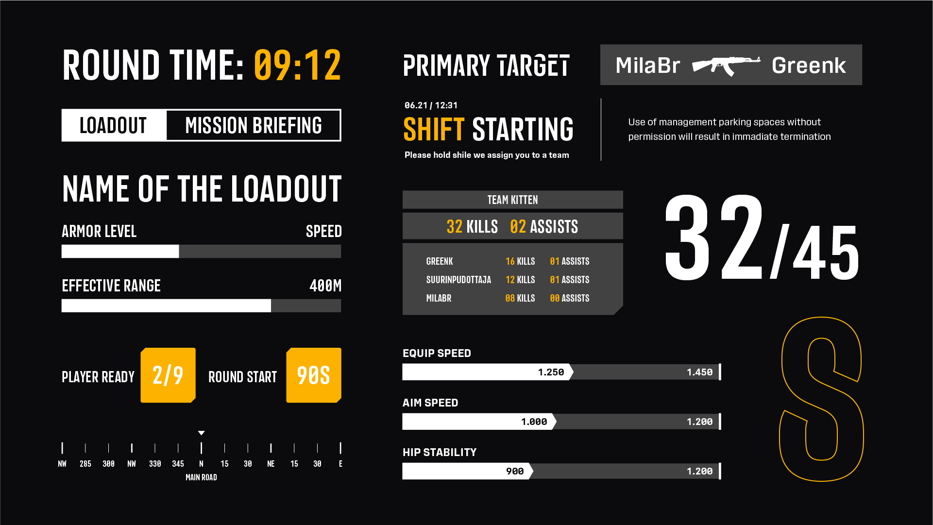 Typefaces like DIN and Trade Gothic are successful for a reason. They are neutral, mechanical looking and considered workhorses that can be used in many situations. Theses references matched the games' story line – futuristic corporations where being an assassin is just an everyday job – perfectly.